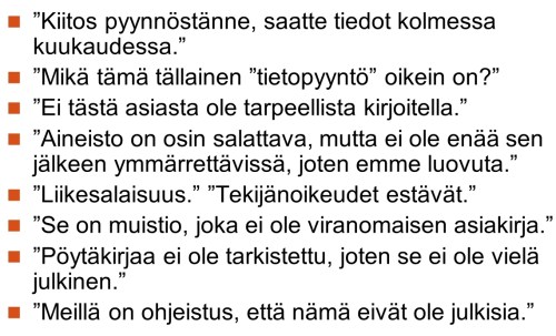 Valitettavasti tämä tärkeä yhteiskunnallinen tiedonsaantioikeus ei käytännössä toteudu niin hyvin kuin sen pitäisi. Aikaisemmassa tutkimuksessa on toistuvasti havaittu ongelmia julkisten viranomaistietojen hankkimisessa. Esimerkiksi oheiset lausahdukset (kuva1.) ovat viranomaisten antamia vastauksia toimittajien tekemiin tietopyyntöihin – ja ne ovat enemmän tai vähemmän virheellisiä. Lisäksi tietopyynnöt voivat vaatia aikaa ja vaivaa, eivätkä asiakirjat välttämättä taivukaan uutisaineistoksi. Aihetta tunteva toimittaja osaa kuitenkin kyseenalaistaa väärät viranomaisvastaukset ja kiertää vastaantulevia hidasteita.